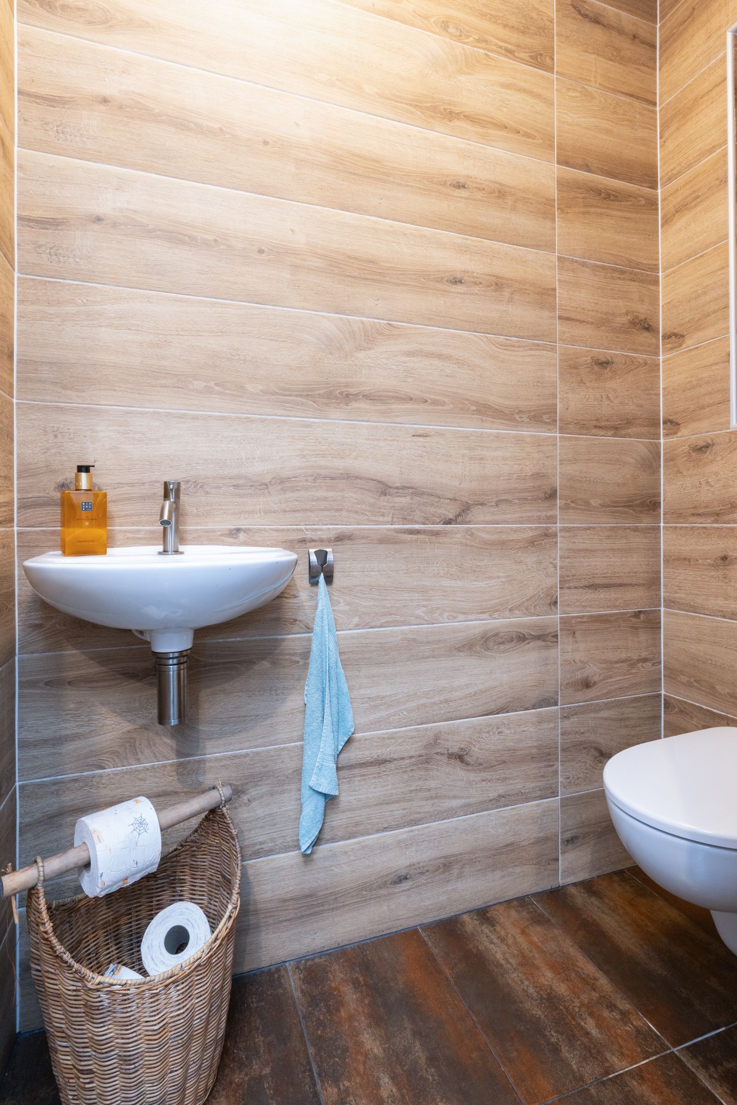 Overloop met geheel betegelde toiletruimte voorzien van staand toilet en fonteintje