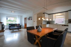 Woonkamer met half open keuken. Totale oppervlakte 40m2. De halfopen keuken biedt een complete nette keuken in hoekopstelling voorzien van keramische kookplaat, afzuigkap, afwasmachine en combioven. Vanuit de woonkamer biedt een schuifpui toegang naar het overdekt terras vanuit de keuken een loopdeur. De woonkamer is verder voorzien van een houtkachel. De gehele begane grond heeft vloerverwarming. Vanuit de keuken is de kelder bereikbaar.
